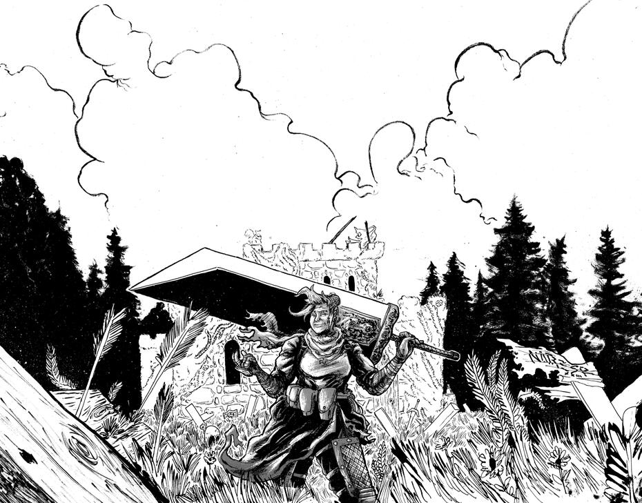 βΊinked scenes w/ 1 character and background w/ halftone $250 USD